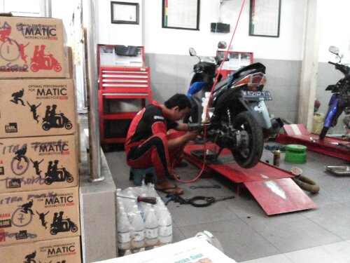 So di hari Sabtu pagi yang cerah berawan ini MR ke beres Yamaha dekat rumah sambil mendorong motor plus mendapat pertanyaan yang seragam dari 5 orang, mulai tetangga, satpam, sampai tukang kebon 😀 , motornya kenapa mas, putus beltnya, jawab MR sambil semangat 45 mendorong motor ke bengkel,  lumayanlah ada 500 meteran.