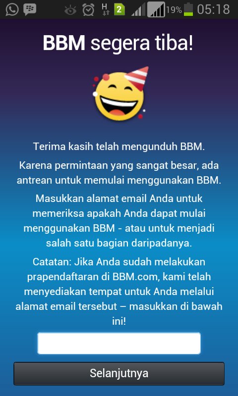 Ternyata begini mazbro, ketika dilaunching pertama kali bulan lalu yang bisa dibilang gatot alias gagal total, kita yang berminat kan disuruh mengisi alamat email kita jika nantinya BBM sudah dilaunching, nah MR ngga mengirimkan email, makanya MR sempat pending 1 hari.