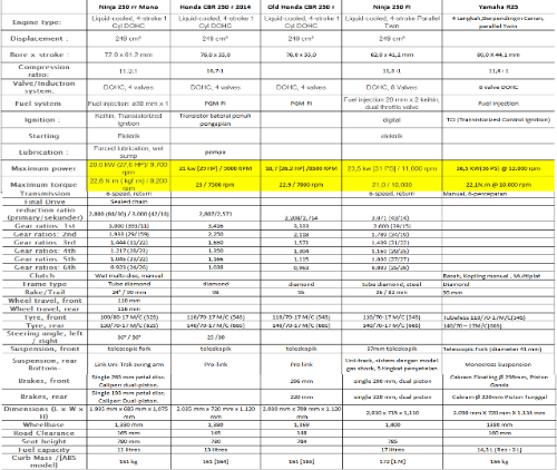 Komparasi Spek mesin YZF R25 vs Ninja 250Fi vs CBR 250 vs Ninja 250 RR Mono