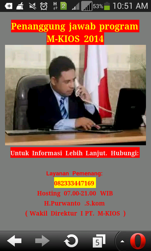Dan terakhir untuk meyakinkan para calon korbannya, blog tersebut juga mencantumkan nomor telpon yang bisa dihubungi untukย konfirmasi pemenang plus memasang foto seseorang dengan nama H.Purwanto .S.kom yang diakui sebagai Wakil Direktur I PT. M-KIOS, dan MR yakin itu foto nyomot dari internet (mosok ada penipu memasang fotonya sendiri ๐ ) Parahnya, secara tidak langsung, nama blogger, utamanya blogger yang menggunakan blogspot sebagai media nge-blognya turut tercoreng akibat ulah si blogger kurang kerjaan ini.