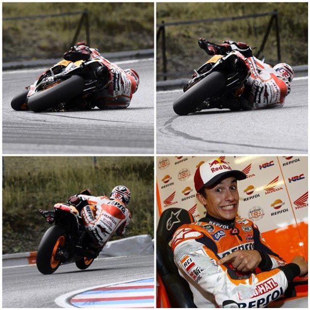 Namun kegilaan Marquez semakin menjadi, saat melakukan tes motor yang akan dipakai tahun 2015 di Brno seusai lomba, yang dilakukan pada Senin (18/09). Seperti yang terlihat di foto yang diupload di facebook Marquez diatas, yang terlihat saat menikung di tikungan ke 10, yang diberi nama Schwantz corner, dia kehilangan grip di ban depan sehingga motor terjatuh, dan secara reflek lengan kanan Marquez menahan berat motor dan tubuhnya agar tidak terjatuh, ssembari lengannya menggerus aspal!! Untungnya Marquez segera membuka throttle gas nya secara perlahan sehingga motor dan badannya bisa kembali dan tidak terjatuh, ueediiaannn tenan arek siji iki!!