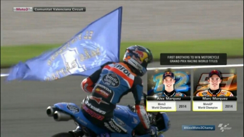 Mazbro n mbaksis, after thrilling Moto3 race which just finished a few minutes ago, Alex Marquez wins the Moto3 Championship title. Along with this achievement, Alex and Marc, his brother made another history an record of Motorcycke Grand Prix Racing, they both becoming the first ever brothers who wins the world motorcycle grand prix racing title!!