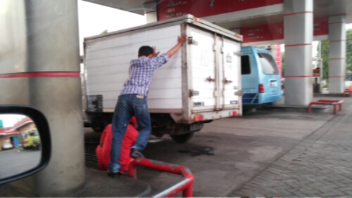 Mazbro n mbaksis, kalau liat foto diatas, apa kira-kira yang ada di benak mazbro n mbaksis semua? Mobilnya mogok?? Ngga mazbro n mbaksis, itu mobil box ngga mogok, tapi ngisi bensin. Tapi konyolnya,