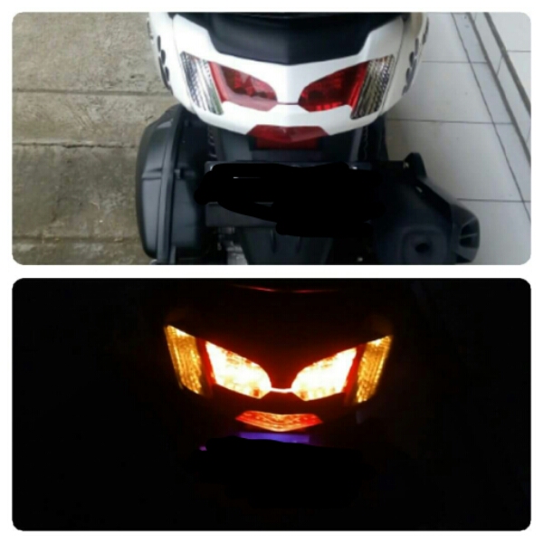 Modifikasinya gampang banget sih, cuma dikasih semacam cover lampu yang akhirnya mengubah tampilan stoplamp yang sebelumnya lebar dan polos menjadi sekilas seperti tampilan stoplampnya Suzuki Burgman 200, jadi mewah tampilannya.