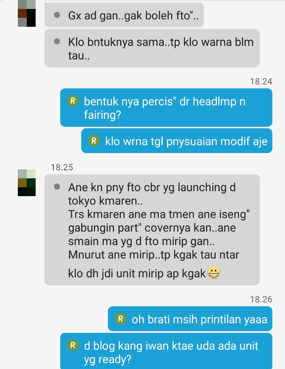 Nah….semua itu dilengkapi dengan bocoran chat bbm antara pembaca setia motorrio.com , mas Taufik (bukan Niswan 😀 ) dengan temannya. Monggo disimak dan disimpulkan sendiri bocoran Honda CBR250RR via percakapan bbm dibawah ini…