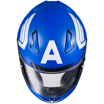 hanya berkelir biru muda, dengan huruf A di bagian depan – yang merupakan ciri khas Captain America – dan logo sayap di kanan kiri (yang mirip logonya Honda ya?) plus logo HJC di samping kanan bawah helm serta logo Marvel di samping kiri bawah helm. O iya, logo tameng wwrna merah abu-abu di bagian belakang helm memberi sentuhan sedikit “ramai”. So simple!!