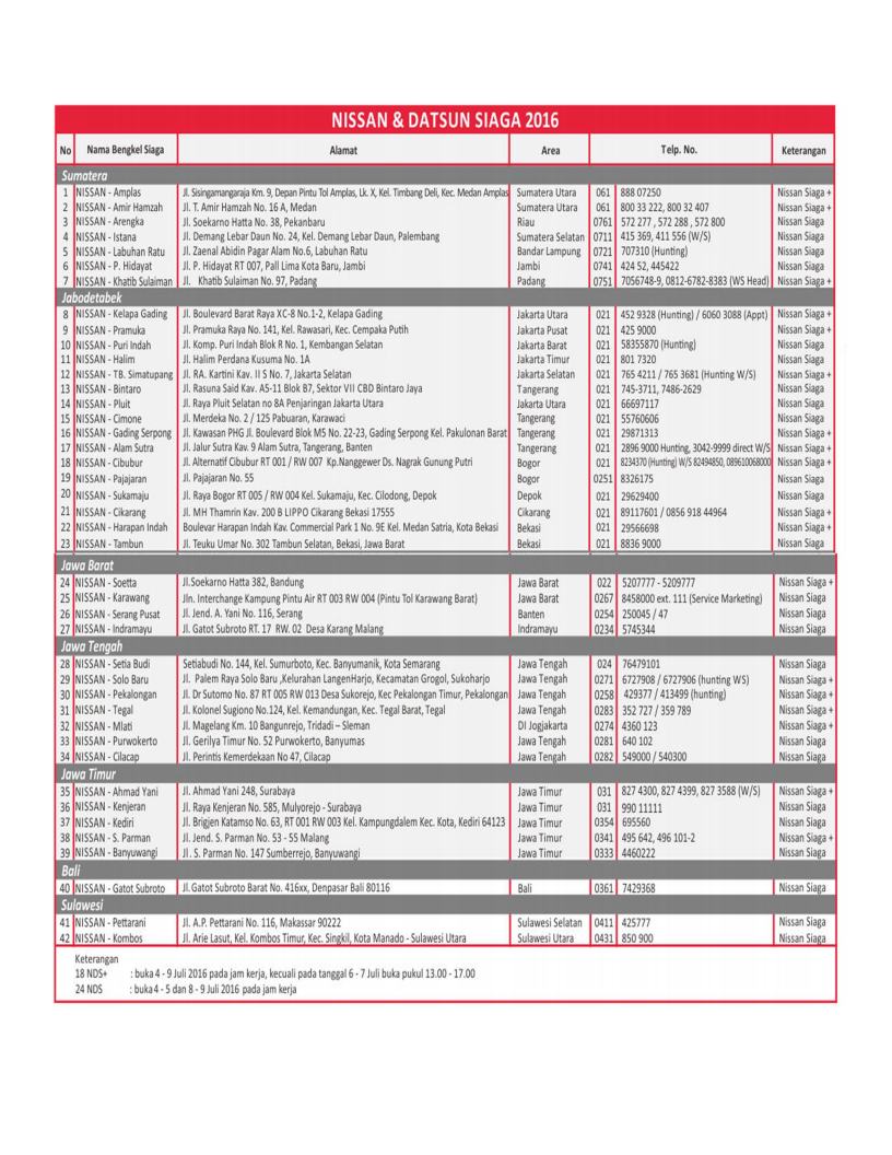 bagi mobil maupun penumpangnya, apalagi jika kondisi tidak fit. Nissan Datsun selaku prinsipal di Indonesia, juga menyediakan pos-pos siaganya untuk melayani para pemudik pengguna Nissan Datsun, berikut daftar pos-pos Nissan Datsun Siaga 2016