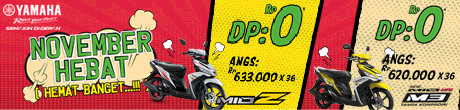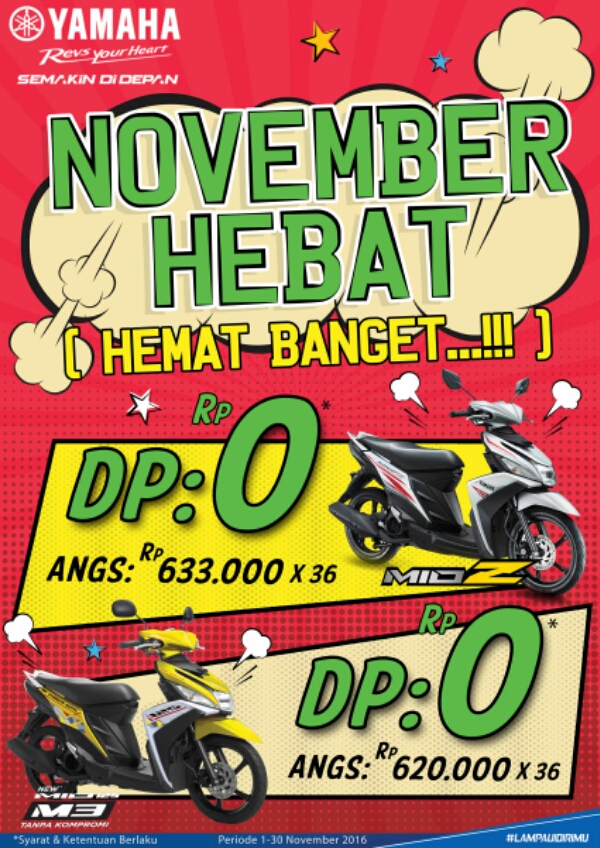motorrio.com – Yamaha via STSJ lagi bikin promo nih!! Dengan hashtag NOVEMBER HEBAT (Hemat Banget), hadir khusus untuk para pencinta motor matic Yamaha, Yamaha Mio Z dan Yamaha Mio M3 125cc. Nah di program ini konsumen yang belum berkesempatan memiliki motor Yamaha semakin dimanjakan dengan cicilan yang murah dan angsuran selama 36 kali