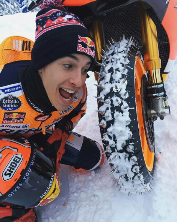 motorrio.com – Marc Marquez lagi kumat isengnya nih!! Gimana ngga, Honda RC213V yang baru saja mengantarnya menjadi juara dunia MotoGP 2016 diajak riding di salju!! Pastinya bakalan sliding kanan kiri atas bawah kalo nekat dengan ban bawaan pabrikan.