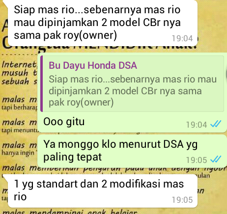 Dan ternyata ada surprise di WA selanjutnya, bahwa Pak Roy (owner DSA) ingin agar MR diberi kesempatan untuk test ride dua unit sekaligus milik Honda Wing DSA, Alhamdulillah!! Satu unit yang standar, dan satu unit modifikasi, begitu isi WA nya. Hmmm…..jadi penasaran, unit modifikasinya seperti apa ya??? Stay tuned…..