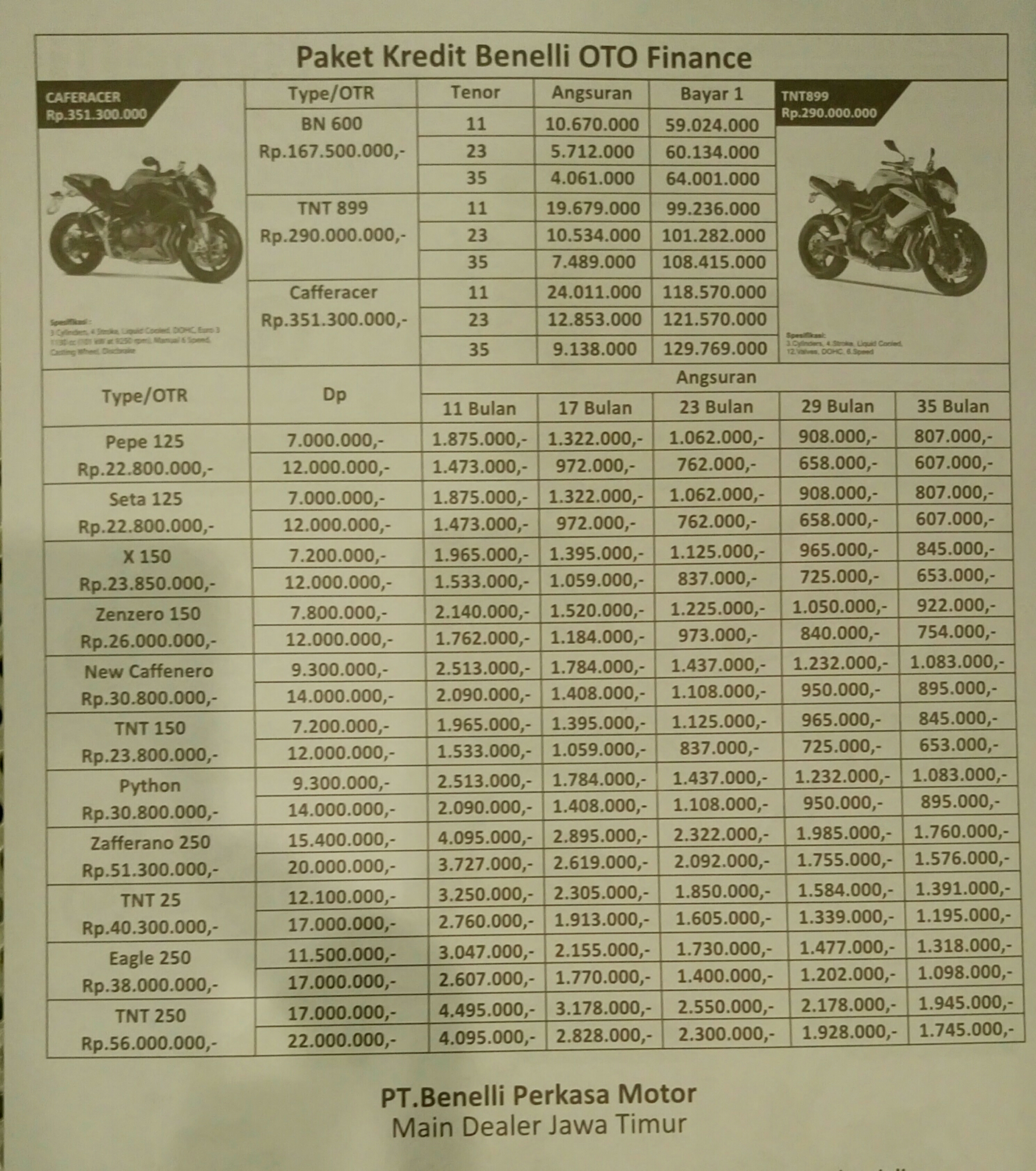 motorrio.com – Di ajang Surabaya Motor Show 2017 lalu, hanya ada tiga brand motor yang hadir, Benelli, VIAR dan GazGas. Sebenarnya dari selentingan yang MR dengar, ada beberapa brand motor yang akan showoff juga, seperti MV Agusta, namun entah mengapa tidak jadi. Dari booth Benelli, MR mendapat list harga dan varian serta skema cicilannya, monggo disimak….