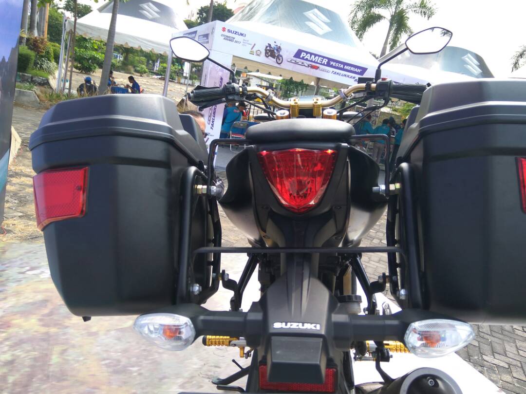 Tampilan ala motor turing ini tampak serasi dan pas, sehingga tak terlihat kedodoran, plus kombinasi warna hitam doff dipadu gold kelihatan sporty abis!! Bisa jadi rujukan modif nih, dan tampaknya aksesoris yang dipasang masuk genuine accesories Suzuki atau yang disebut SARP (Suzuki Accesories Racing Parts). So ga menggugurkan garansi motor baru, karena merupakan produk resmi dari Suzuki. Kalau berminat bisa sambangi dealer Suzuki terdekat dikota masing-masing yah!!