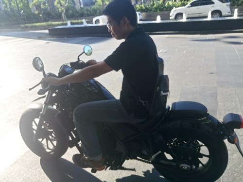 Beruntung MR mendapat rute berbeda dari rekan sebelumnya, dari depan lobby menyusuri parkiran mobil lanjut keluar menuju jalan kembar di samping CiWo, dimana MR bisa sedikit eksplore karakter mesin dan handling Honda CMX500 Rebel hitam ini. Saat di parkiran mobil yang wajib pelan-pelan, mesinnya terasa nurut, ngga meledak-ledak seperti motor sport, wajar karena genrenya Cruiser. Shock depan belakang nyaman, ngga terlalu keras ataupun terlalu empuk, terbukti saat melewati “polisi tidur” di parkiran.