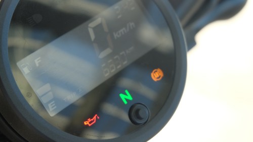 Begitu giliran MR tiba, langsung putar kunci kontak di sisi kiri bawah tangki Honda CMX500 Rebel ke posisi ON dan nyalakan starternya, halus juga suaranya, mungkin pengaruh desain mufflernya, berbeda dengan CB500R kata teman yang pernah cobain, lebih garang, padahal basic mesinnya sama. Spidometer digital bulat dengan backlight biru yang memuat informasi motor cukup jelas dan mudah dipantau baik saat siang, apalagi malam hari, jelaass!!