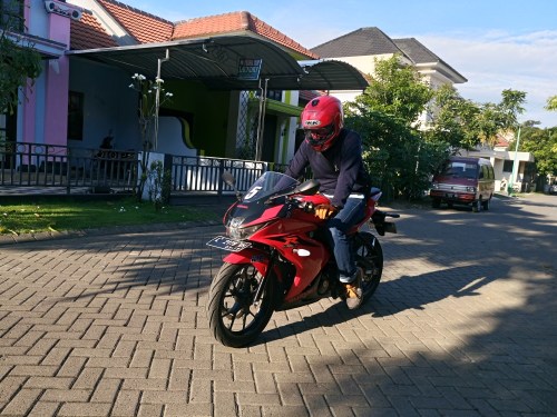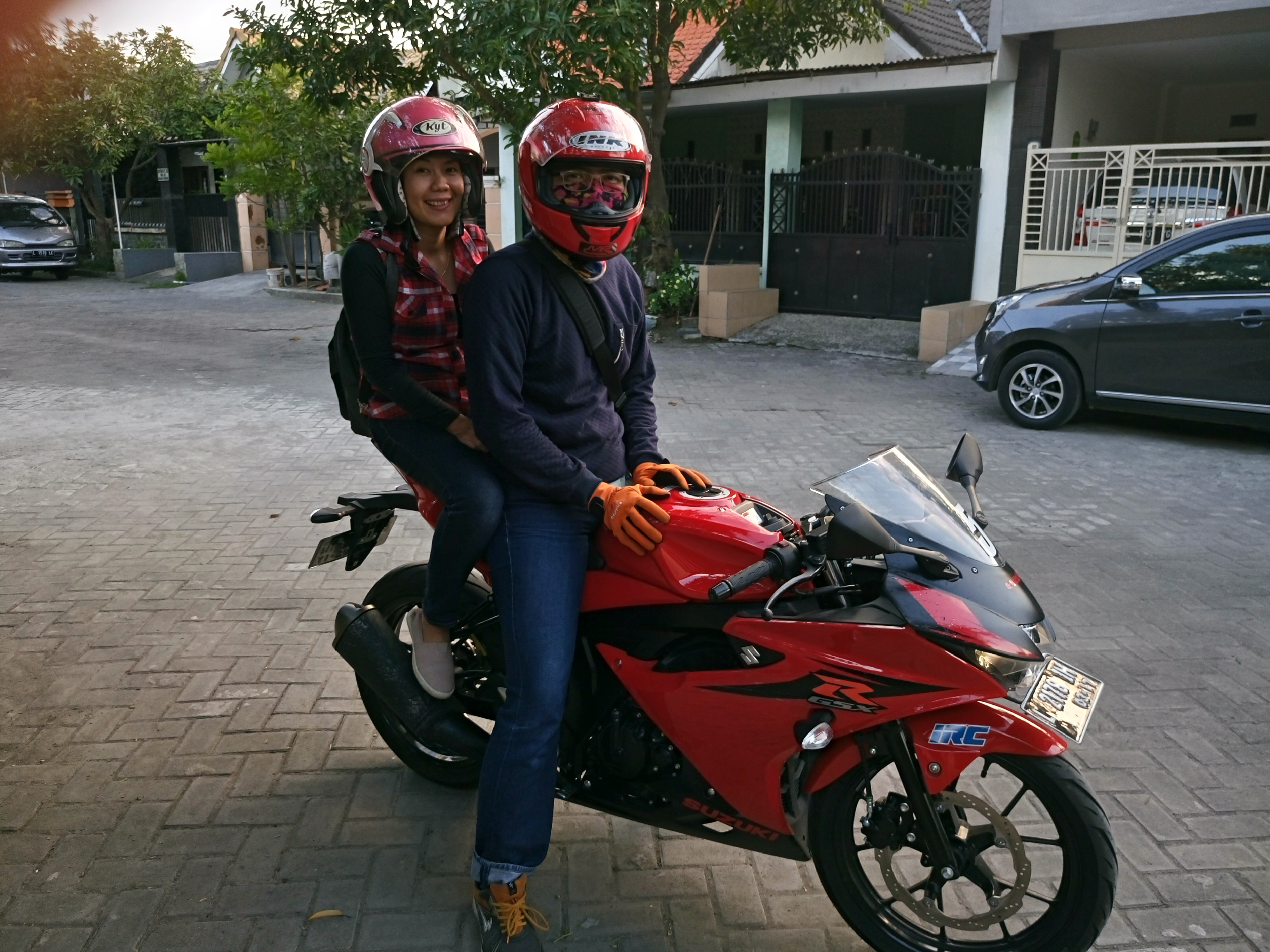 Di hari kedua MR sempat mengajak istri untuk riding menggunakan GSX-R150, sekalian melihat respon istri mengenai posisinya sebagai boncenger. Kesan pertamanya joknya lumayan tinggi, jadi kalau mau naik harus bertumpu dulu di pijakan kaki kiri, baru naik ke atas jok, maklum istri MR imut, 155cm tingginya, jadi maklum deh.
