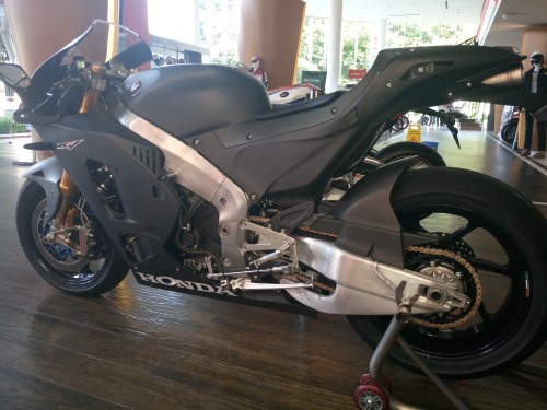 “Sasis belakangnya ya fairing carbon fibre itu mas, jadi tidak ada sasis lagi sebagai penahan dibawah rider untuk menopang bobot tubuh rider”, lanjut Sigit saat menjelaskan kecanggihan Honda RC213V versi road legal ini. Dan info dari mas Sigit kalau RC213V ini hanya akan dipajang bulan Juni sampai Juli 2017, namun sampai tanggal berapa di bulan Juli nya masih belum tau pasti.