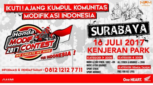motorrio.com – Ajang Kumpul Komunitas Modifikasi Indonesia, Honda Modif Contest 2017 seri ke 4 kembali digelar di Surabaya. Bertempat di Kenjeran Park, ajang kontes modif motor Honda ini ditargetkan bakal diikuti 1.500 peserta penggemar modifikasi Tanah Air.