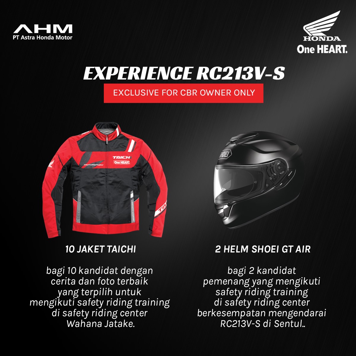 Untuk 10 orang kandidat dengan foto dan cerita terbaik yang terpilih untuk mengikuti safety riding training di Safety Riding Center Wahana Jatake, masing-masing akan mendapatkan 1 Jacket Taichi. Dan 2 orang pemenang terbaik yang mengikuti safety riding training di safety riding Wahana Jatake mendapatkan kesempatan riding RC213V-S di Track Day Tanggal 20 Agustus 2017 di Sentul. Dan masing-masing akan mendapatkan Helm Shoei GT Air!!