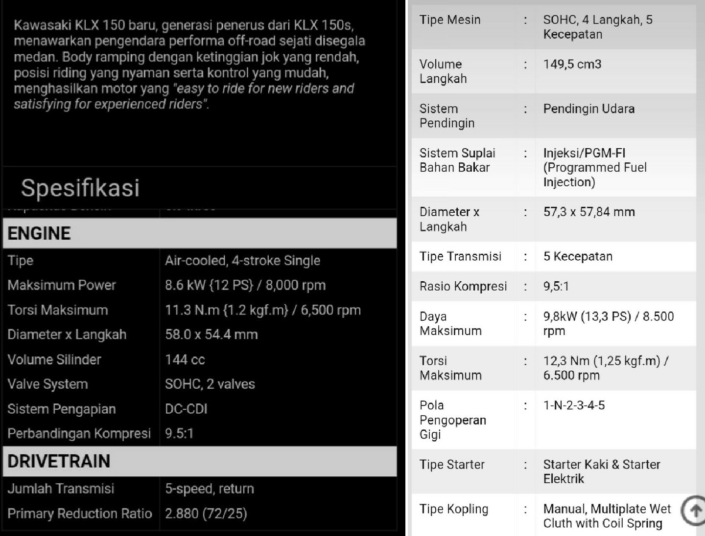 Sedangkan untuk torsi malah lebih ganas lagi, sama-sama diraih pada 6500 rpm, Honda CRF150 lebih besar 1 Nm dibanding KLX 150, yaitu 12,3 Nm (CRF150) versus 11,3 Nm (KLX150). Namun untuk spesifikasi sebenarnya masih belum ada, tapi kalau benar spesifikasinya seperti diatas, Kawasaki perlu upgrade lagi terutama disisi mesin.