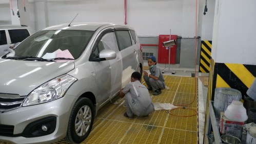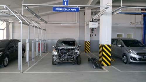 Bagusnya lagi, tiap tahap perbaikan memiliki stall sendiri – sendiri, untuk pemeriksaan awal, bongkar pasang, tarik bodi, dempul, ruang pengecatan, sampai poles ada semua. Mobil yang keluar dari sini seolah kembali baru, karena semua proses yang dilaksanakan disini sudah sesuai dengan standar Suzuki.