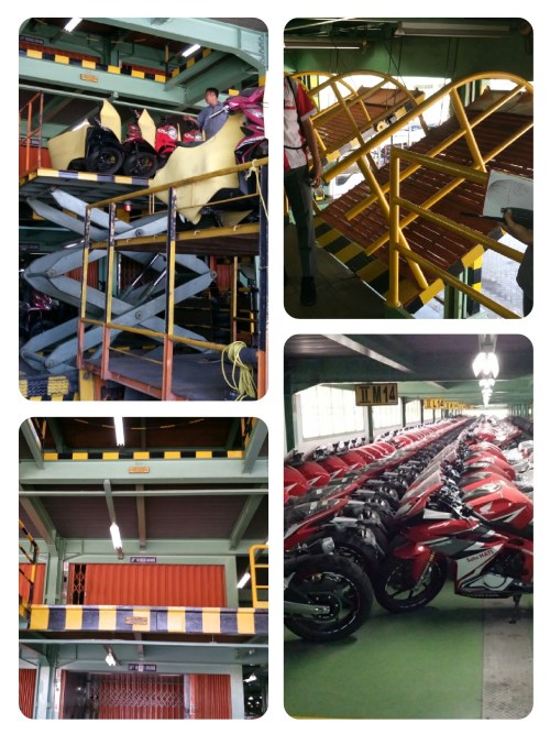 Dan agar lebih memudahkan arus keluar masuk unit, ada empat anjungan di belakang dan tiga didepan untuk memasukkan atau mengeluarkan unit. Di posisi depan menggunakan lift hidrolis, sedang yang dibelakang semacam jembatan hidrolis untuk menaikkan motor ke posisi atas bak truk (biasanya disusun dua tingkat).