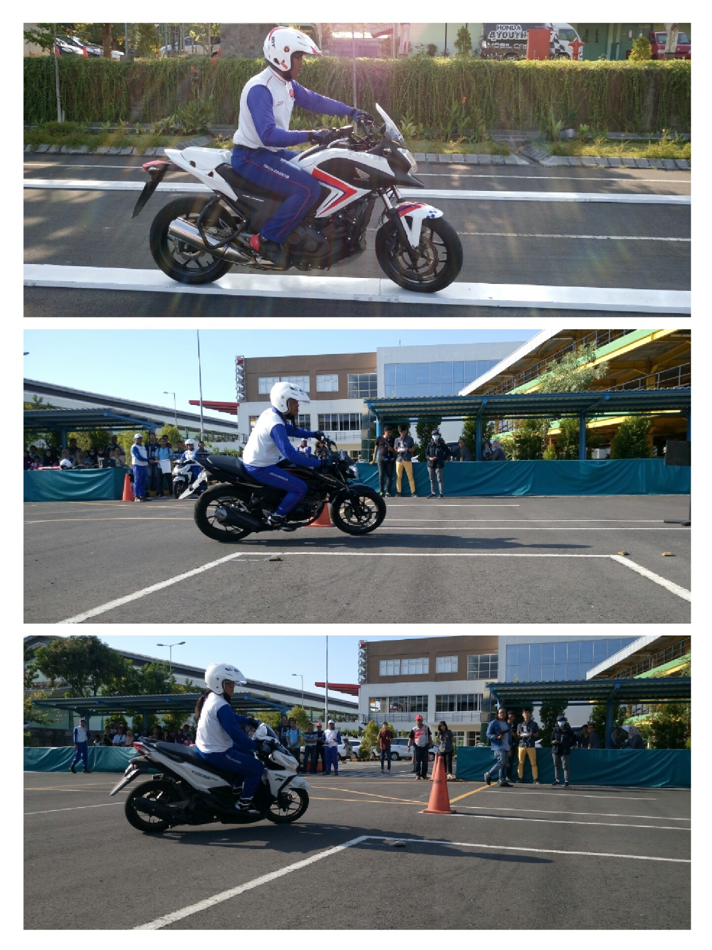 Sesi berikutnya adalah melihat atraksi Safety Riding dari tim MPM Honda di sirkuit, dimana dari atraksi tersebut memperlihatkan sekilas praktek dari teori Safety Riding pada keadaan riil di jalanan, dengan menggunakan tiga kendaraan sekaligus, NC750, Vario, dan CB150R.