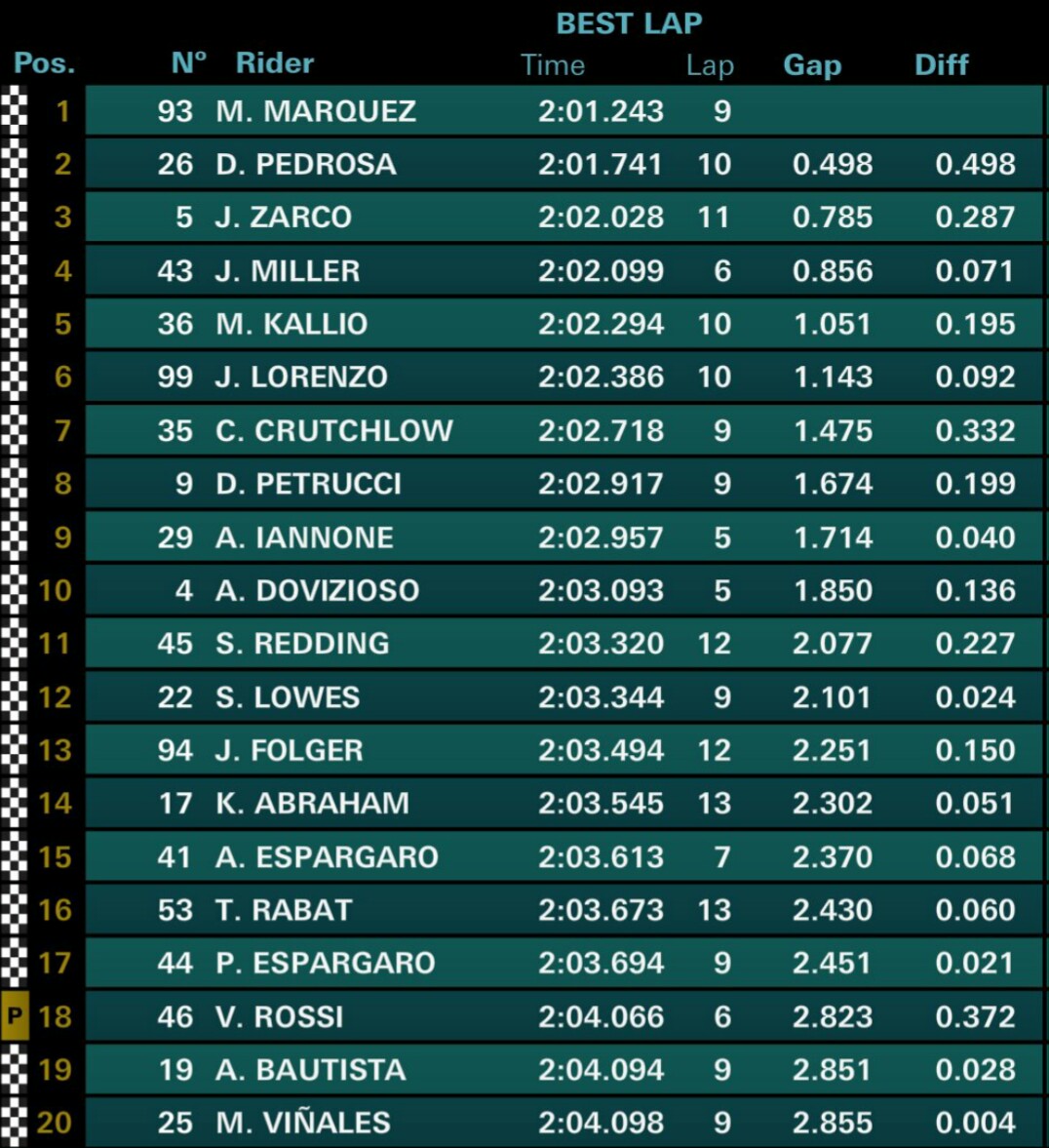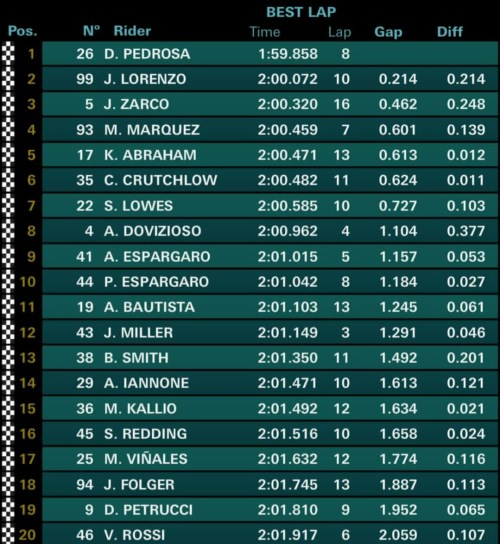 Masih dalam kondisi trek dan cuaca yang mendung, Pedrosa mampu memperbaiki posisinya dengan meraih posisi pertama, namun sebaliknya Marquez malah turun ke posisi empat. Duo Movistar Yamaha? Masih terpuruk di 20 besar!! Rossi di posisi 20, sedangkan Viñales naik ke posisi 17. Zarco malah anteng di posisi tiga dibawah Lorenzo yang meraih posisi dua.