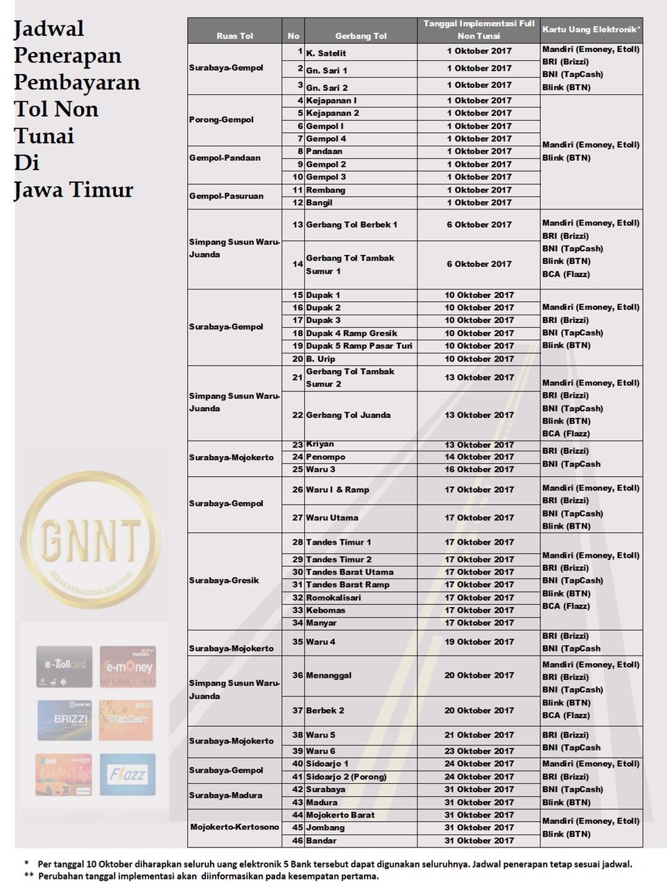 Nah….agar mazbro n mbaksis tak terkendala hal tersebut, segera saja membeli kartu e-money di bank terdekat seperti BRIZZI dari bank BRI atau e-money dari bank Mandiri sebelum terkendala saat masuk gerbang tol. Atau kalau masih belum sempat beli, bisa melihat jadwal penerapan e-toll di tabel berikut ini, sehingga bisa memperkirakan jadwal perjalanan via ruas tol yang masih bisa menerima pembayaran tunai, semoga berguna