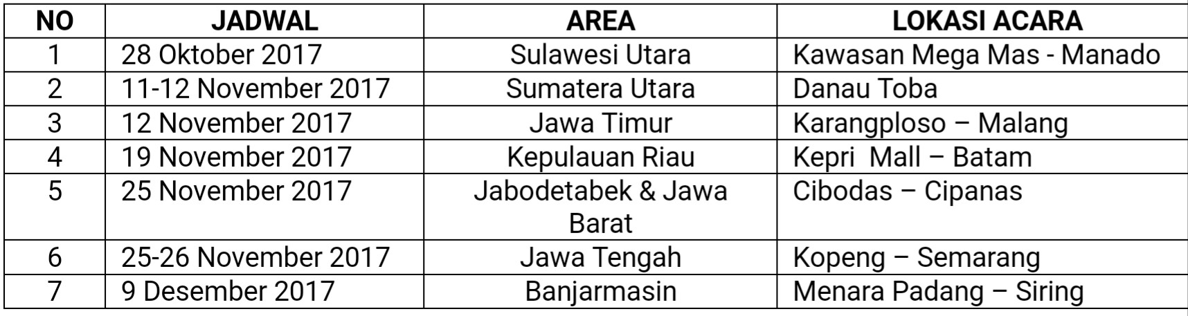 Suzuki Bike Meet jelang penghujung tahun 2017 rencananya akan diadakan di lokasi yang telah memiliki kekuatan dan jumlah pengguna motor Suzuki yang besar, ditambah pemilihan lokasi yang cocok untuk melepaskan rutinitas sehari-hari. Berikut ini adalah jadwal dan lokasi pelaksanaan Suzuki Bike Meet :