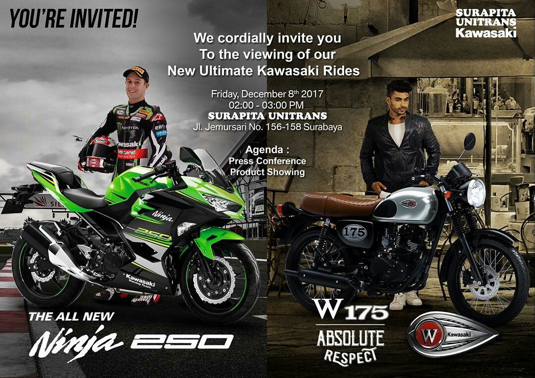 Surapita Unitrans launching Kawasaki All New Ninja 250 dan W175 – motorrio.com – Surapita Unitrans selaku Main Dealer Kawasaki di Surabaya dan Jawa Timur alhirnya akan melaunching All New Ninja 250 dan W175 secara bersamaan di Surabaya besok (08/12). Berlokasi di head quarter nya Surapita Unitrans di jalan Jemursari no 156-158 Surabaya, Kawasaki all out untuk memperkenalkan duo produk premium terbarunya.