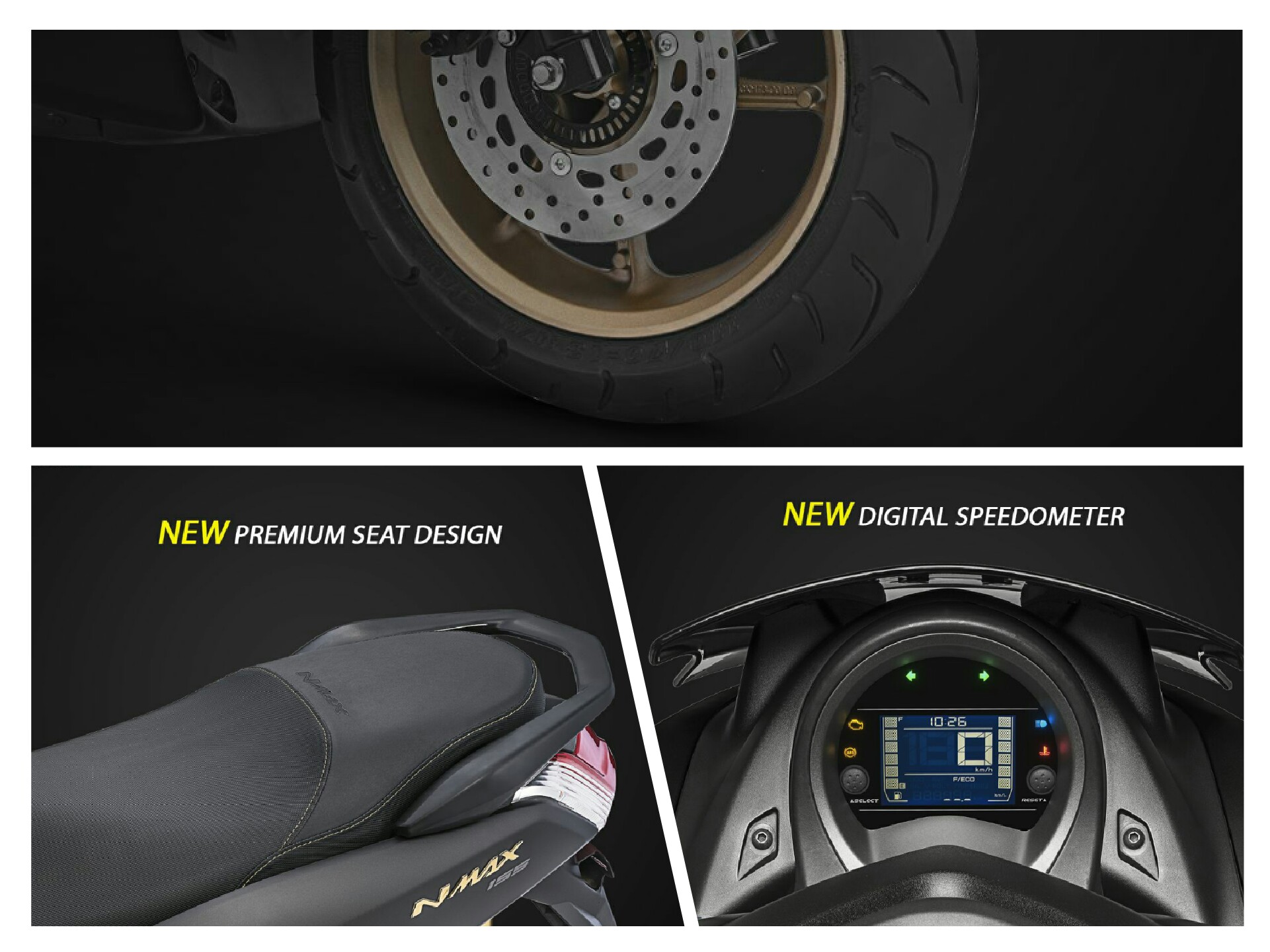 - New Premium Seat Design mempadukan dua tekstur kombinasi dengan emboss logo NMAX yang disatukan dengan motif jahitan elegan membuat tampilan motor menjadi lebih berkelas.