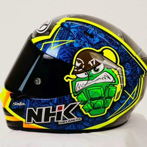 Didesain oleh Starline Designers, yang sudah mendesain helm para pembalap MotoGP, seperti Andrea Dovisioso, Pol Espargaro, kali ini Starline Designers mengambil tema militer, dengan grafis kartun peluru di sisi kanan dan granat tangan di sisi kiri, plus nomor 17 yang merupakan nomor start dari Karel Abraham.