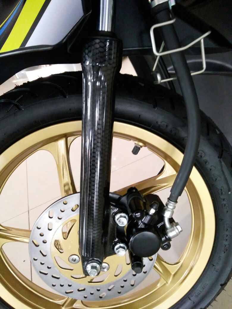 Shock depan dan cover filter dibalur stiker motif karbon, velg dicat warna emas mentah, dan tak lupa spion juga diganti variasi berwarna gold juga.