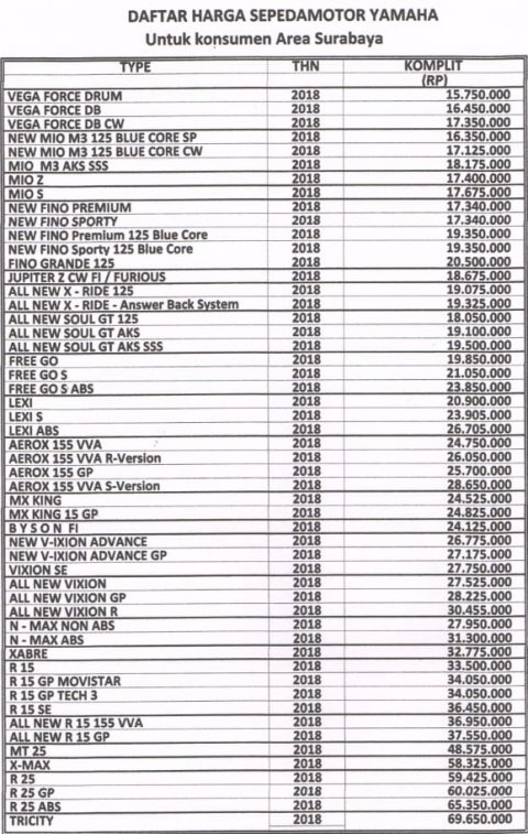 Merilis sport 250cc terbarunya R25, Yamaha juga tak lupa merilis versi R25 ABS. Namun Yamaha tak melupakan segmen underbone, dan tentunya matic yang mendapat beberapa update si 2019. Berikut daftar harga motor Yamaha untuk area Surabaya per akhir Desember 2018 yang masih berlaku sampai Januari 2019 ini. Berikut daftarnya