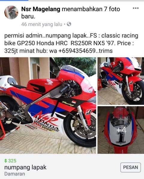 Honda RS250R dijual – motorrio.com – Beberapa hari yang lalu MR iseng browsing di Facebook melihat-lihat grup yang ternyata banyak banget di FB MR. Kebanyakan sih karena tiba-tiba dijadikan anggota sama mbuh sopo, pingin dihapus kok ya banyak banget, biarin aja deh!