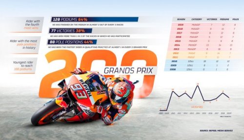 Statistik Marc Marquez, pelan tapi pasti bakalan jadi the unbeatable – motorrio.com – Setiap rider pasti ada masanya, dan setiap rekor pasti akan terpecahkan oleh para suksesornya. Di era Grand Prix two stroke ada rekor dari Mike Hailwood yang rekor kemenangannya baru saja dilewati Marc Marquez meraih kemenangan ke 77 kali di Misano 2019.
