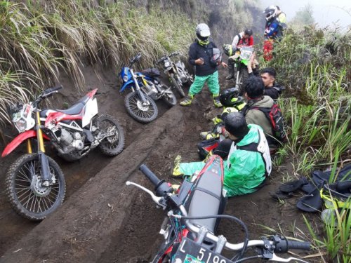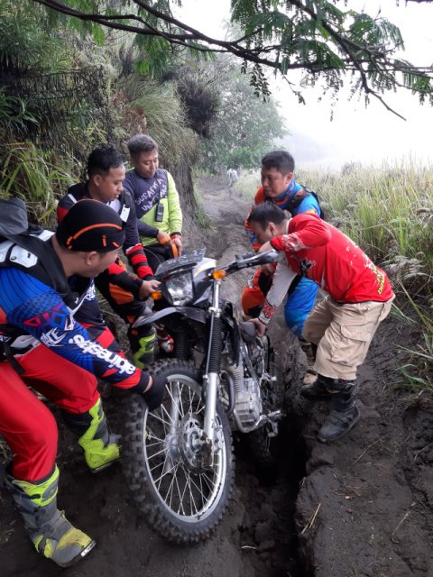 Rute yang paling berat adalah saat menuju berasa di perhentian di salah satu puncak di perbukitan yang mengelilingi lautan pasir Bromo. Jalan berpasir menjadi menantang karena banyak cerukan sedalam hampir semeter namun selebar badan motor yang menguras skill dan tenaga kalau terjerumus kedalamnya, dan yess…motor MR terjebak disana!!