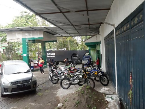 Berangkat dari lokasi tikum di PT Surapita Unitrans, tepat jam 07.00, on time, ga pake molor! Nyampainya juga pas jam 09.00 di tikum Purwosari. Setelah sarapan dan memakai apparel untuk trabas – protector, helm, google, dan sepatu trail – plus berdoa, dimulailah acara Adventure Trail with Media to Bromo!! Disediakan 18 motor yang dibawa dua truk Surapita Unitrans, dua diantaranya adalah KLX230 dan satu KLX230R, sisanya KLX150BF.