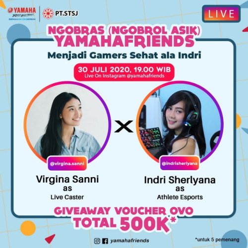 Acara NgobrAs Yamahafriends bareng Indri Sherlyana ini akan tayang secara live di Instagram @yamahafriends pada hari Kamis, 30 Juli 2020 jam 7 malam. Buat para gamers atau yang hobi push rank bisa dapet info dari sumber yang sudah menjalaninya. Dan tidak ketinggalan akan ada giveaway voucher OVO senilai total ratusan ribu untuk yang berhasil menjawab pertanyaan yang akan diberikan saat acara berlangsung.