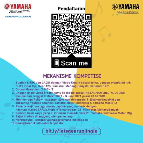 2. Jingle harus sesuai dengan tema “Let’s GEAR Up!” dan wajib terdapat kata “Let’s Gear up”, “Gear 125”, “Yamaha”, “Menang Banyak”, “Generasi 125” pada lirik jingle