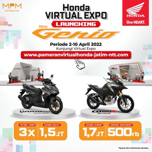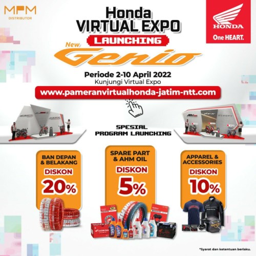PT. Mitra Pinasthika Mulia (MPM Honda Jatim) selaku distributor sepeda motor Honda hadirkan Virtual Exhibition Special Launching New Honda Genio yang diadakan pada periode 2-10 April 2022, pengunjung bisa mengikuti Virtual Exhibition ini dengan langsung meng-aksesnya melalui gadget di www.pameranvirtualhonda-jatim-ntt.com.