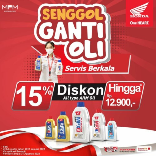Selain program Merdeka Bersama AHASS, konsumen Honda dapat memanfaatkan program “Senggol Ganti Oli Service Berkala” yakni diskon pembelian oli sampai 15% atau hemat hingga Rp. 12.900,-. Voucher ini bisa didapatkan di aplikasi Brompit. Segera dapatkan Diskon menarik ini karena Voucher promo berlaku selama persedian masih ada.