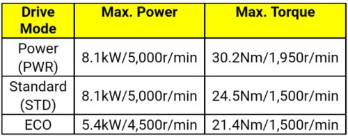Salah satu keunggulan dari kendaraan listrik E01 adalah motor penggerak listrik yang memiliki rpm tinggi. Mampu menghasilkan tenaga sebesar 8.1kW/5,000r/min dan torsi 30.2Nm/1,950r/min dalam mode berkendara power, membuat tarikan motor tetap responsif ketika berkendara tandem dan melwati jalan menanjak.