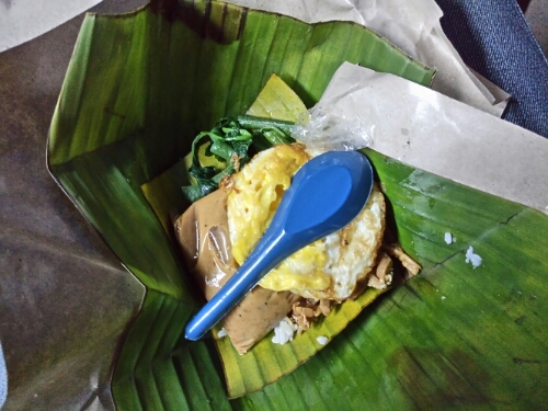 Saat berhenti di Madiun, turun bentar cari kuliner khas Madiun: pecel Madiun. Ternyata ada pecel fast, alias pecel yang udah dibungkus seharga IDR 13rb/bungkus. Begitu dibuka isinya lumayanlah, nasi punel panas kepul-kepul dilapisi daun pisang, sesachet sambal pecel Madiun, sebiji telor ceplok, sejumput sayuran rebus, plus sebuah sendok plastik biru.