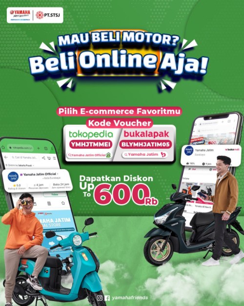 Yamaha STSJ – motorrio.com – Sebagai bentuk komitmen Yamaha untuk terus memberikan pelayanan terbaik baik konsumen Yamaha, PT. Surya Timur Sakti Jatim (Yamaha STSJ) selaku main dealer motor Yamaha area Jawa Timur, Kalselteng, Kaltim, dan Nusa Tenggara tiada henti memberikan program menarik bagi konsumennya. Kali ini, Yamaha STSJ memberikan potongan harga spesial bagi konsumen yang melakukan pembelian sepeda motor Yamaha melalui E-Commerce.