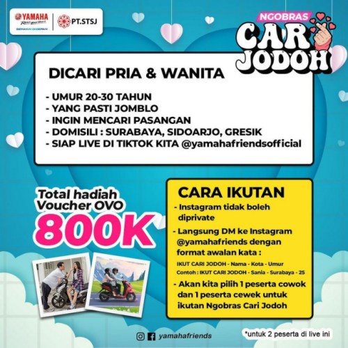 Ngobras Yamaha – motorrio.com – Spesial di bulan penuh cinta ini, PT. Surya Timur Sakti Jatim (Yamaha STSJ) kembali mengadakan Ngobras Cari Jodoh. Tidak jauh berbeda dengan tahun sebelumnya, para pencari jodoh akan dipilih dan diajak untuk makan malam dengan sistem Blind Date.
