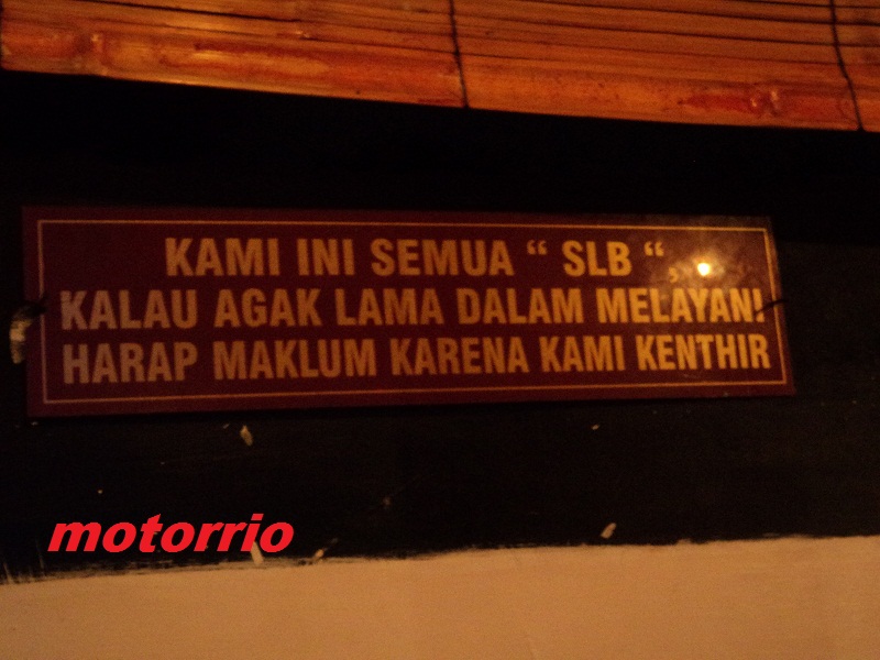 Ditinggal sebentar, MR milih menu sego kucing triple, istri double, lauknya ayam blondo, mie goreng, pepes ikan. Minumnya Ryu pesen es krim bakar, MR wedang serai, coz cuaca Jogja lagi dingin dan badan lagi rada ga enak, istri pesen es kacang merah. Pesenan diambil, sambil nunggu mata MR tertuju pada tulisan di dinding masing2 meja, yang bikin ngakak, gini bunyinya “Kami ini semua lulusan SLB. Kalo agak lama harap maklum karena kami kenthir.”