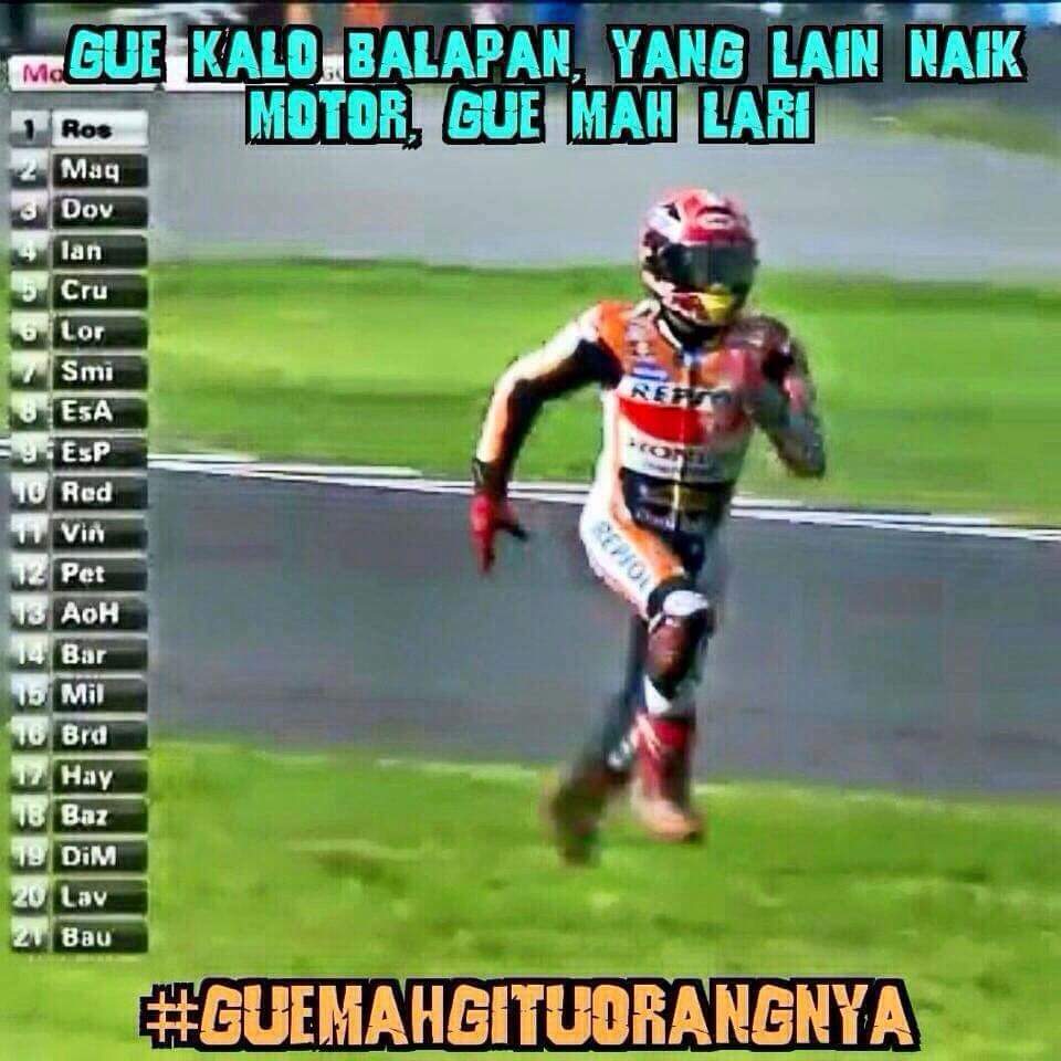 Mazbro n mbaksis barusan dapet WA dari rekan MR, Om VAY yang bikin meme Marquez yang berlari menuju motornya setelah jatuh akibat crash dengan Rossi di MotoGP Argentina Senin dinihari kemarin. Memenya menggelitik, tapi sekaligus menyiratkan semangat Marquez yang pantang menyerah, jozzz…..ngakak sik 😀