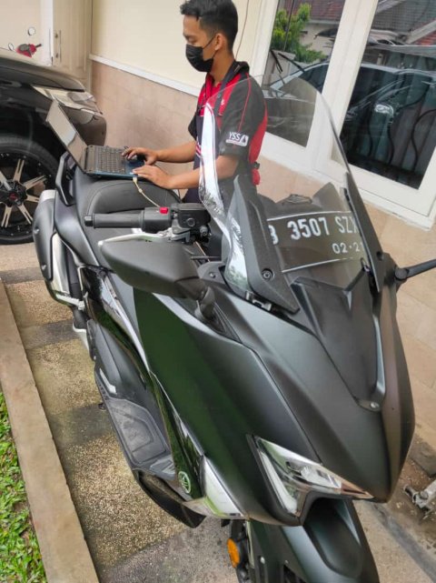 Servis matic Bongsor – motorrio.com – Layanan Servis Kunjung Yamaha (SKY) ngga cuma berlaku di motor kecil, bahkan matic bongsor atau motor gede Yamaha pun bisa dilayani lho! Buktinya, Arif, pemilik Yamaha TMAX 530cc, selalu menghubungi SKY tiap kali servis matic kesayangannya, supaya efìsien waktu dan tidak perlu antri di bengkel resmi Yamaha.