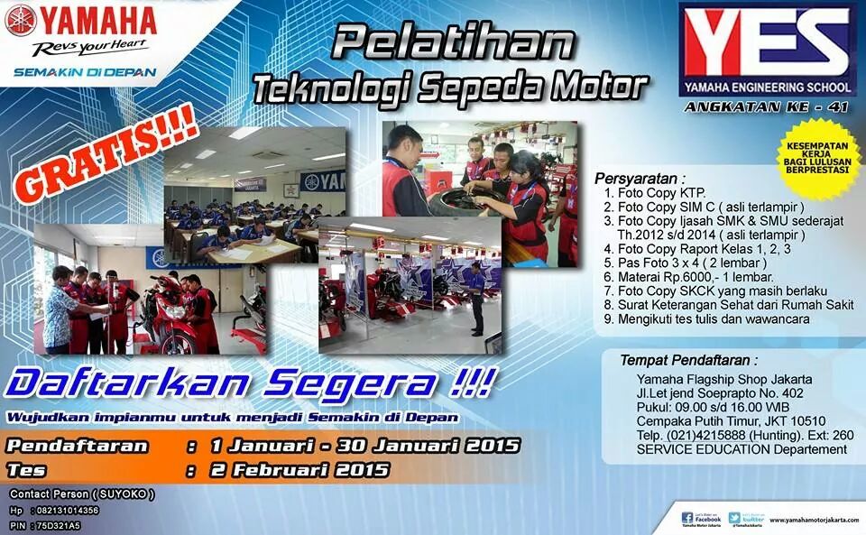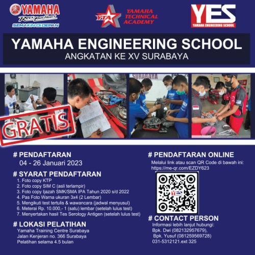 Yamaha Engineering School – motorrio.com – Dalam rangka memenuhi kebutuhan tenaga ahli di bidangnya yang berpengalaman dan berkualitas, PT. Surya Timur Sakti Jatim (Yamaha STSJ) selaku distributor sepeda motor dan spare part Yamaha kembali memberikan kesempatan bagi calon teknisi handal melalui program Yamaha Engineering School (YES). Pelatihan ini merupakan salah satu bentuk ke konsistenan Yamaha dalam menghasilkan teknisi yang berkualitas.